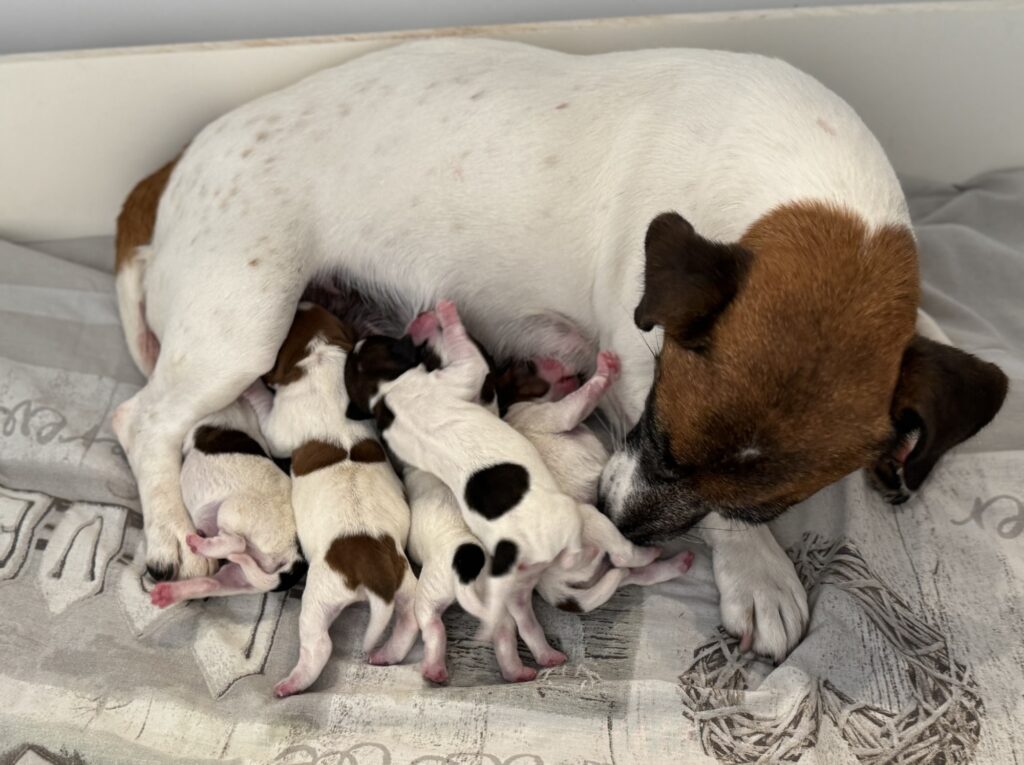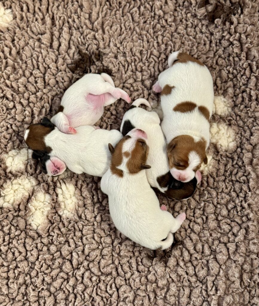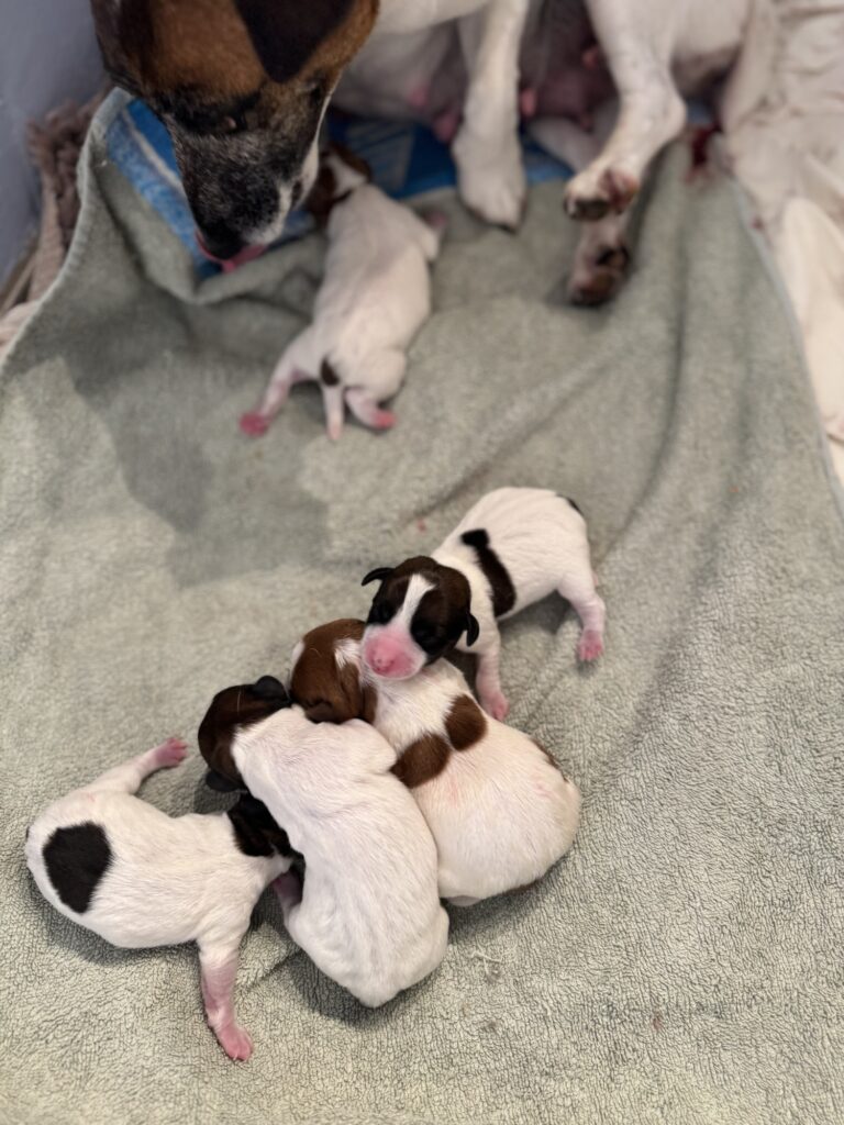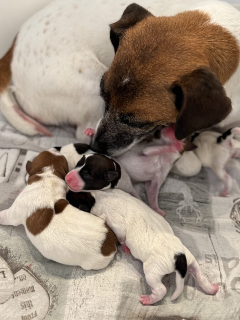Les 5 chiots Jack Russell de la portée de Prisca & Malo sont nés en pleine nuit le 15 Septembre, entre 3h50 et 7h du matin.