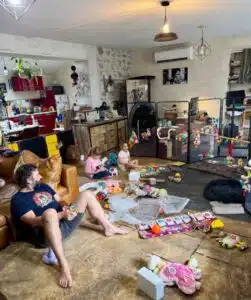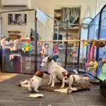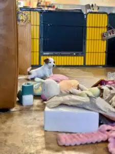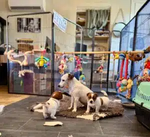 Nos chiots Jack Russell sortent en liberté dans le salon tous les jours pour commencer à bien explorer la pièce (40m²). Une fois qu’ils sont fatigués, ils regagnent leur espace parc (dans le salon).