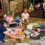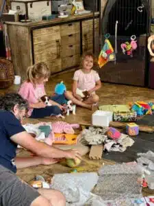 Polystyrène, plastique, peluche, carton, objets brillants/durs/mous/odorants… on essaye d’être le plus varié possible et les familiariser à un maximum de matières qui les touchent sur tout le corps afin que cela fasse partie de la normalité.