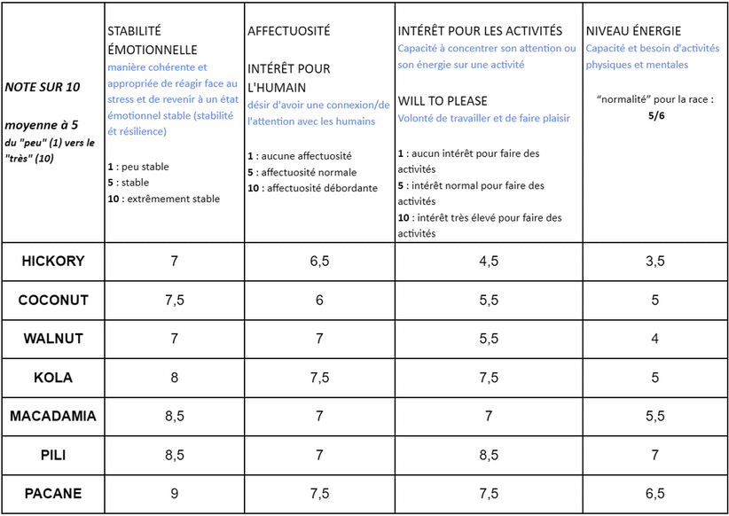 Ce qui nous permet de jauger différents éléments de leur tempérament grâce à une grille critériée.